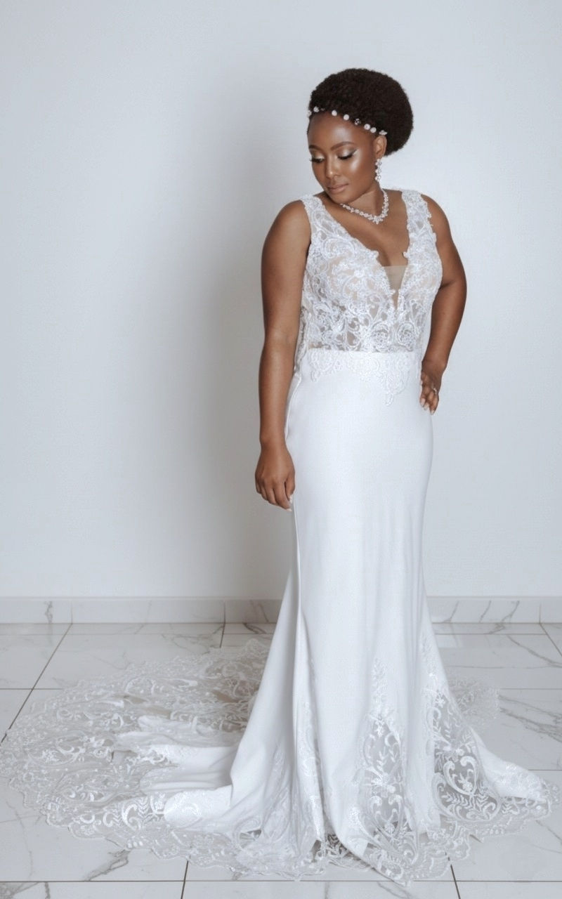 This exquisite gown seamlessly showcases a meticulously floral lace bodice atop sheer illusion mesh, creating a captivating "floating" aesthetic, complemented by a deep V-neckline engineered to elongate the silhouette. The refined stretch crepe skirt gracefully transitions into a breathtaking cathedral-length train, culminating in intricate embroidery and a scalloped hem for a truly dramatic presentation.